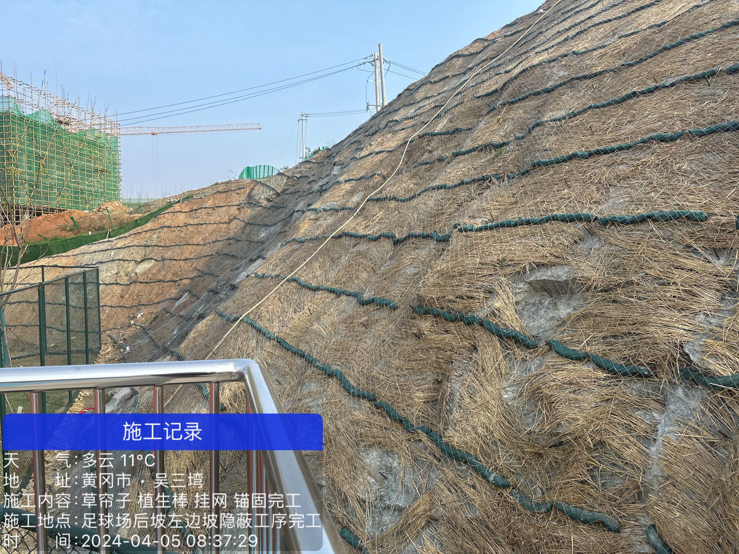 武漢商貿職業學院紅安校區足球場邊坡綠化工程項目-隱蔽工序(鋪設草簾、安裝植生棒、掛鋼絲網、錨固)↓